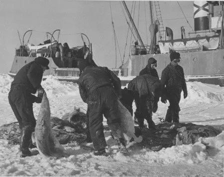 Be thankful that the production stills he took are in black and white; the film was produced in living colour. His footage documented the sealers as they hunted for, and harvested the skins of the “White Coats”, or Harp Seal pups. The tally for pelts taken on that voyage totalled 24,000.